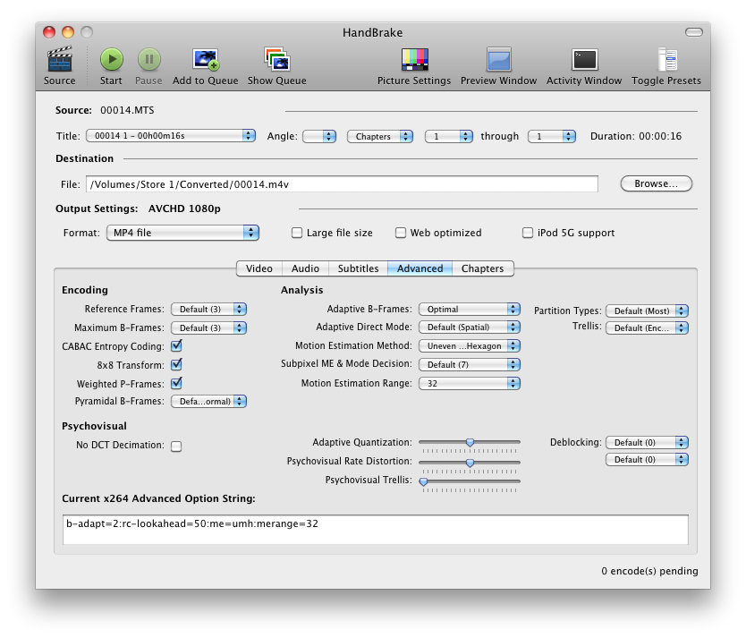 That is all. All editing was done on my mid-2009 iMac with a 3.06 GHz Core2Duo and 4GB RAM. The workflow is really quite simple. Succinctly put, I convert the MTS files to M4V using Handbrake and my custom settings (below). I then import these M4V files into iMovie allowing it to convert the files to MOV and generating thumbnails. Once I edit the movie, I export the same from iMovie using my presets. Couldn’t be simpler. You can click on the images below to view them full-size.