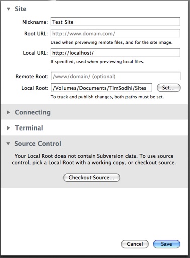 Panic’s Coda is a beautiful, and powerfuleditor, and like Panic’s other products – Transmit and Unison, very OSX in it’s look and feel. What’s more – it features SVN support right off the bat. To this end, one needs to set up a New Site within Coda (it doesn’t work otherwise, trust me). Fill in at least one destination, I suggest Local URL (a dummy location like http://localhost/) and the local root (where the files will be stored). Click Checkout Source and point it to the location of the folder where the SVN repository was created with Versions app, and Bob’s your uncle.