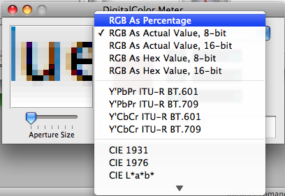 A system wide color dropper utility – DigitalColor Meter allows one to capture the color value from any running application, desktop, text – in short – anything on the screen, in a variety of formats – just press SHIFT+CMD+C to capture it as a text value or OPTION+CMD+C to capture it as an image. Brilliant.