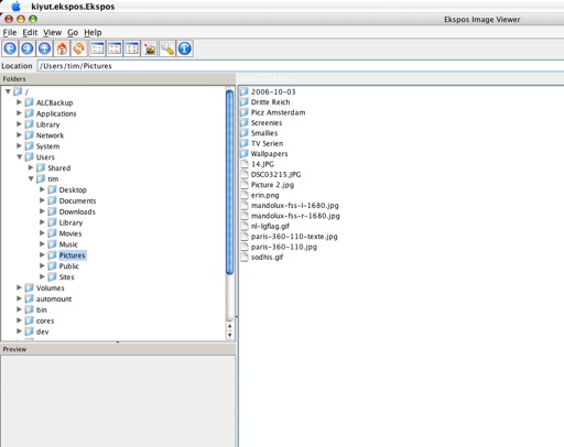 So my search finally comes to an end. I found this handy util, in response to my rant yesterday. Mark sends me an email from Aussieland (after stumbling upon my blog), mirroring my complaint about the lack of an ACDSee level viewer and file manager for OSX. He points me to Ekspos Image Viewer. It is a Java Application, close and similar to ACDSee in layout, and very Linux (KDE) in it’s look and feel. But it works splendidly, and very fast indeed. I believe I have found the answer to what I was looking for. It can be downloaded from http://www.kiyut.com/products/ekspos/index.html.