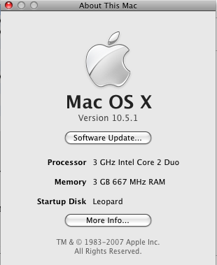 Just a short blog post regarding the recent OSX Leopard update 10.5.1. Attempts to install it the previous evening were met with abject failure on my part, and replacing stock vanilla kernel and kexts helped naught. I had to begin from Zero again, wiping my system clean and this time following documentation and common sense + logic to the T.