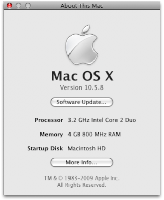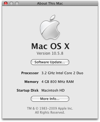 Apple released Leopard 10.5.8 a few days back. The update went without a hitch on my MacBook Pro. The story on my Hackintosh isn’t so great. The choppy performance issues are back, after having been wiped clean in 10.5.7. Argh. I reinstalled OSX to no avail. I nearly borked my system in the process.