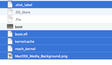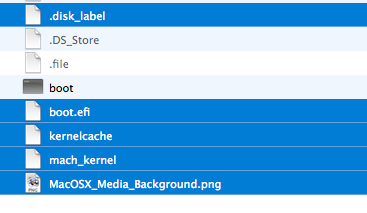 - Copy these five files from Mac OS X Install ESD to Mac OS X Base System:- mach_kernel, .disk_label, boot.efi, kernelcache and MacOSX_Media_Background.png (Illustrated below)