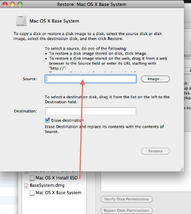 - Click Restore, and as the source, drag the Mac OS X Base System, and in the destination, drag the USB drive or the partition from the left pane. (Illustrated below)