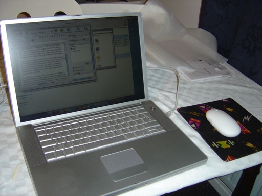 The installation of the RAM went without a hitch, and I restarted the installation of Tiger on the PB! And now, after having installed all the software and rebooted and restarted my WLAN, I am BACK on a Mac baby! How amazing is this, to be able to work on a Mac on my couch!