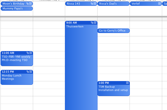 Well, OSX has been running pretty well otherwise. I got the GCALDaemon running just fine, but couldn’t stand the skewed nature of updates and how often the Google calendar updated, so I have sworn off, and come to using Google Calendar exclusively, and have subscribed to the Web feed using iCal. Works pretty well, can’t make any changes in iCal though. Here’s a screenie