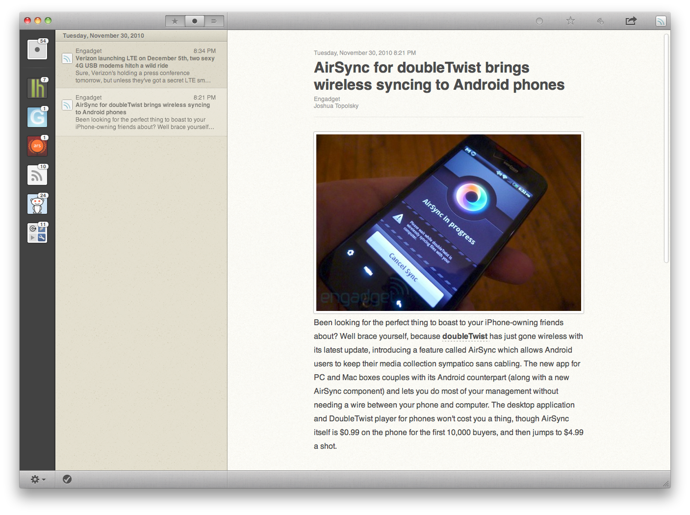 At least in beta, but the best, most minimalist, intuitive RSS reader for iPad and iPhone is now on OSX! Enter Reeder. The developers hit gold with their implementation of a beautiful, three-paned design for iPad, and iPhone. This has now been ported over to OSX.