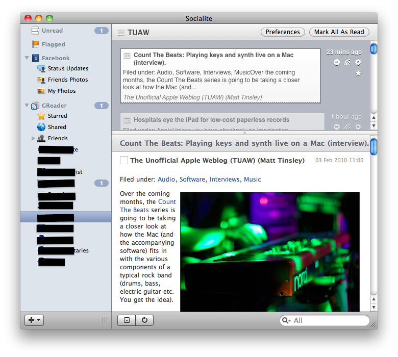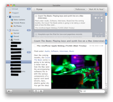 Socialite supports Google Reader in it’s entirety, allowing one to subscribe to a feed from the client, unsubscribe, mark as read/unread, star/unstar, etc. With Growl support, this is by far the best Google Reader RSS feed client for the Mac. What’s more, this client integrates support for various social networking APIs such as Facebook, Twitter, etc. A definite MUST try.