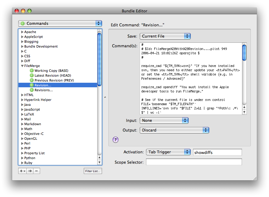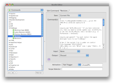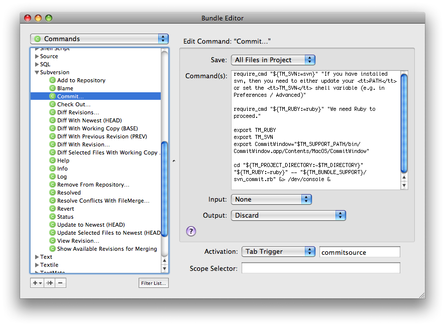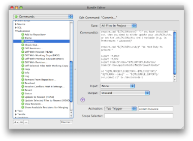 Perhaps the BEST feature so far – use TextMate tab triggers to trigger SVN events. Tab Triggers are used in TextMate by assigning a set of letters followed by a TAB key press, to trigger an associated event. You can pretty much do anything you like with Tab Triggers, from inserting pieces of Code in TextMate to SVN file commits. To set up a Trigger for an SVN Commit, go to Bundles->Bundles Editor->Commands. Choose Subversion from the list. Choose a command from the list, and in the right pane choose a method of Activation from the Drop down – Tab Trigger. To it, assign any combination of words. I chose “commitsource” for COMMIT.