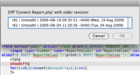 However, of late as I start to work with larger projects with a lot of embedded logic, and process flows, it has become a pain in the proverbial behind to switch from Coda to an app that will fold code. The forums and blogs are abuzz with developers’ dissatisfaction with the lack of Code folding, and the staff at Coda don’t seem to care. If only I could configure SVN with TextMate, and that too in a comprehensive, intuitive way, I could move away from Coda, forever. It seemed to be a pipe dream, i.e. till now. I have successfully set up SVN with TextMate and in a way that mirrors the ease of COMMIT, REVERT, DIFF found in Coda. Here’s a how-to.