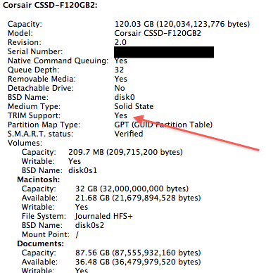 A few caveats – I haven’t yet tried to stress test my SSD to see whether TRIM has made any real world difference. Additionally, since this relies on KEXT changes in /S/L/E, it is conceivable that on the next update from Apple, this change is overwritten. In any case, will keep you guys posted. For now though, enjoy seeing a “Yes” next to TRIM support.