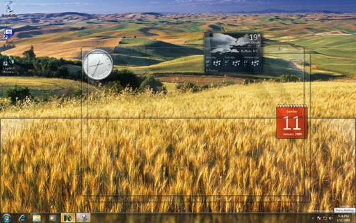 AeroPeek – on moving the mouse cursor to the bottom right, the Windows stacked on the desktop become transparent. Visual eye candy, this can be useful when trying to get to the files on the desktop. This feature seems to replace the ubiquitous "Show Desktop" on previous versions of Windows.